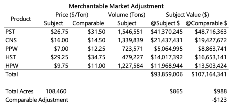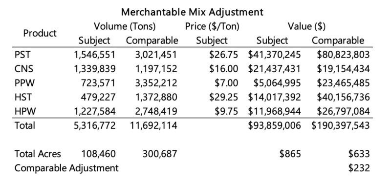 The merchantable mix adjustment is designed to isolate and adjust for the difference in quantity and product mix of merchantable timber. In a nutshell, it is the per acre difference between the subject at subject pricing and the comparable at subject pricing. The table below provides a real-world example from the appraisal of a large, planted pine property in Texas.
