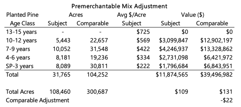 While the merchantable mix adjustment is designed to isolate and adjust for the difference in product mix, the premerchantable mix adjustment is designed to isolate and adjust for the difference in premerchantable planted pine age classes. Like the merchantable mix, it is the per acre difference between the subject at subject pricing and the comparable at subject pricing. The table below provides an example of a premerchantable mix adjustment from the same appraisal of a large, planted pine property in Texas.