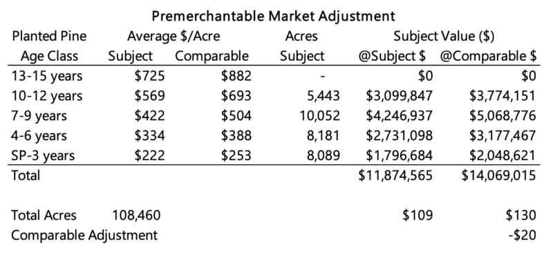 The average values per are for each strata for the subject property and for the comparable were applied to the total acres in each strata for the subject, with the resulting total values divided by the total subject acreage. The resulting $130/acre value for the comparable was then subtracted from the $109/acre value for the subject to yield the derived $20/acre downward premerchantable market adjustment. As with the premerchantable mix adjustment, the relatively small adjustment indicates that the subject and comparable are relatively similar.